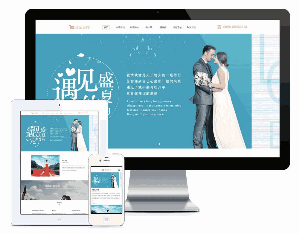 婚庆服务公司网站源码制作的网站主色调为浅蓝色,网站有在线预约功能,主程序为WORDPRESS程序,为响应式网站,带自适应手机版面。